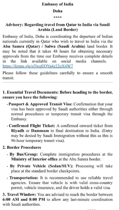 ഖത്തറിൽ നിന്ന് കര അതിർത്തി വഴി മടങ്ങുന്നവർക്കുള്ള നിർദ്ദേശങ്ങളുമായി ഇന്ത്യൻ എംബസി.