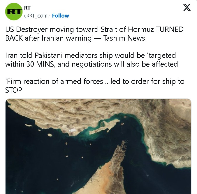 പശ്ചിമേഷ്യയിൽ ശാശ്വത സമാധാനം കണ്ടെത്തുന്നതിനായി ഇസ്ലാമാബാദിൽ യുഎസ്-ഇറാൻ ചർച്ചകൾ തുടരുന്നതിനിടെ ഹോർമുസ് കടലിടുക്കിൽ വൻ സംഘർഷാവസ്ഥ. കടലിടുക്കിലേക്ക് നീങ്ങിയ അമേരിക്കൻ ഡിസ്ട്രോയർ ഇറാൻ്റെ കടുത്ത മുന്നറിയിപ്പിനെത്തുടർന്ന് പിന്തിരിഞ്ഞതായി ഇറാനിയൻ വാർത്താ ഏജൻസിയായ തസ്നിം ന്യൂസിനെ ഉദ്ധരിച്ച് ആർ.ടി (RT) റിപ്പോർട്ട് ചെയ്തു. 30 മിനിറ്റിനുള്ളിൽ ആക്രമിക്കുമെന്ന ‘അറ്റാക്ക് വാണിംഗ്’ നൽകിയതിനെത്തുടർന്നാണ് യുദ്ധക്കപ്പൽ പിന്മാറിയത്.